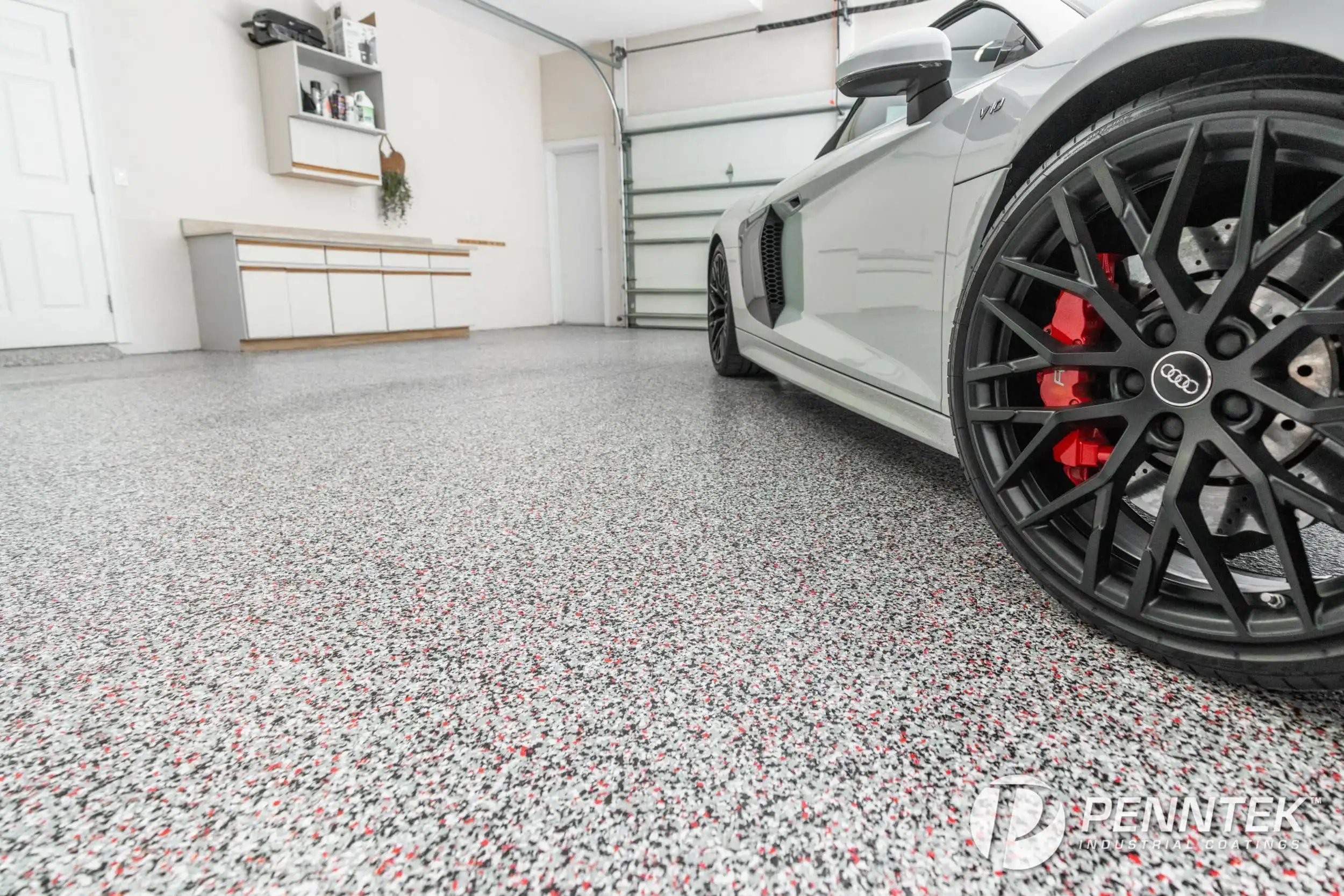 Now comes the fun part—adding personality to your floor. While the base coat is still wet, we broadcast decorative vinyl flakes across the surface. These flakes come in a variety of colors and sizes, allowing you to customize the look of your garage floor. The result is a textured, visually striking design that’s uniquely yours.
