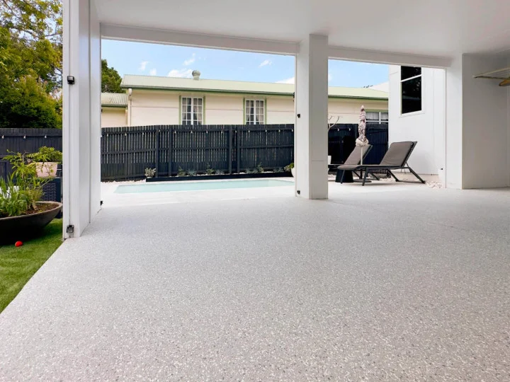 No. The decorative flakes add texture that provides slip resistance. Anti-slip additives can also be included for extra safety, especially in areas prone to moisture.